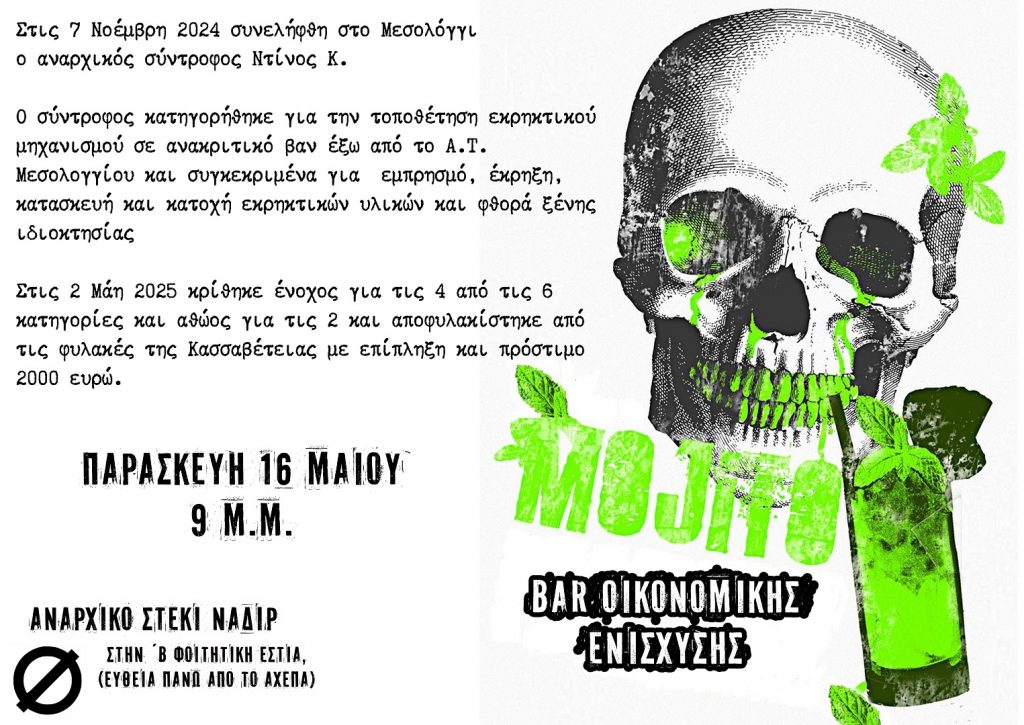 Στις 7 Νοέμβρη 2024 συνελήφθη στο Μεσολόγγι ο αναρχικός σύντροφος Ντίνος Κ.